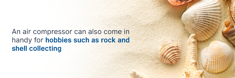 An air compressor can also come in handy for hobbies such as rock and shell collecting. If you scan the beach for rare and unique rocks, air-powered tools could help you bring out the luster and shine in these special finds. This could come in especially handy if you collect rocks to use in jewelry items and homemade crafts.