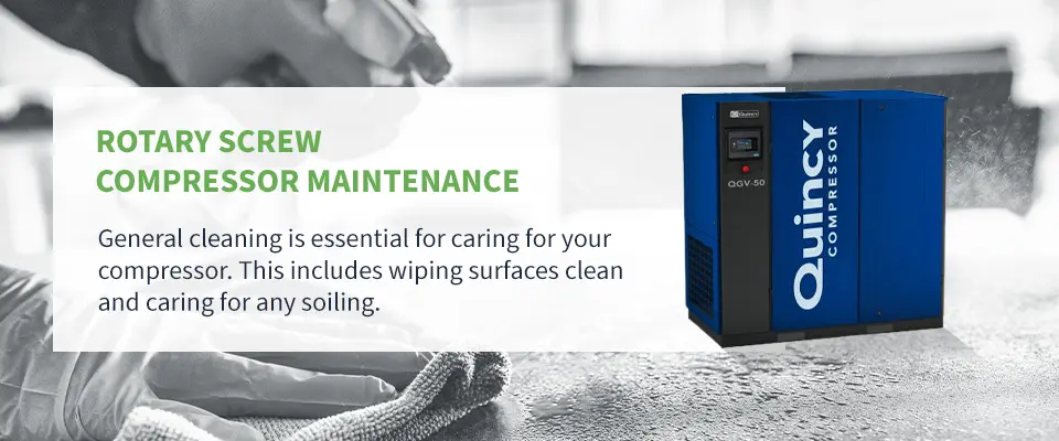 General cleaning is essential for caring for your compressor. This includes wiping surfaces clean and caring for any soiling. Soiling can cause temperature increases, reducing output and increasing the power the unit needs to produce air.
