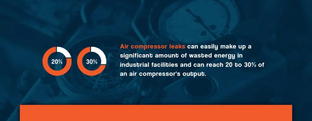 An air compressor leaking air can easily make up a significant amount of wasted energy in industrial facilities and can reach 20 to 30% of an air compressor’s output. That means 20 to 30% of all the money you put into your air compressor in the form of utilities is going down the drain — or more aptly, up in the air. With a proactive leak detection and repair program, facilities can reduce leaks to less than 10% of the compressor’s output. Depending on the size of your system and facility, air leakage elimination can be a massive saving and improvement to your bottom line.