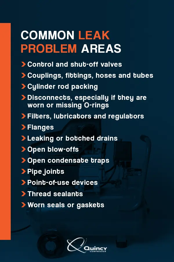 Leaks can happen throughout a plant — from the source of compressed air to the distribution pipes and the point of use. While it is important to pay attention to the whole system, some areas deserve a little extra care.Some of the most common problem spots for leaks include: