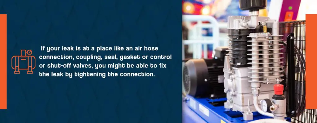Once you find a leak, quickly repairing it is the next step. If your leak is at a place like an air hose connection, coupling, seal, gasket or control or shut-off valves, you might be able to fix the leak by tightening the connection. Tightening parts is one of the most straightforward ways to fix air compressor leaks. Of course, it’s not always this simple. Other times, leak repair is more complicated and costly, especially if you want to prevent problems in the future.
