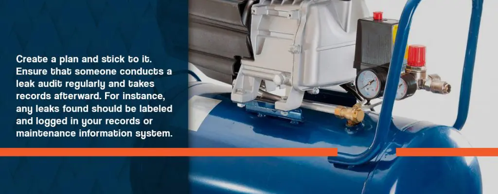 Create a plan and stick to it. Ensure that someone conducts a leak audit regularly and takes records afterward. For instance, any leaks found should be labeled and logged in your records or maintenance information system. Pay special attention to any problem areas or components that may be wearing out.