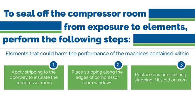 In an insulated room, the quality of air can be compromised by any given number of overlooked factors. For example, if small gaps exist around a door when it’s shut, air is going to pass between that door no matter how tight it’s locked. By the same token, gaps around a window — regardless of how slight they might be to the naked eye — will cause conditioned indoor temperatures to be diluted with slivers of airflow from the outside. To prevent these factors from compromising the air quality in your compressor room, apply weather stripping as needed.