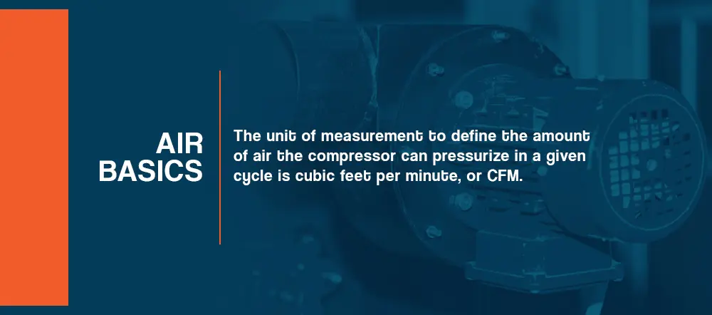 The unit of measurement to define the amount of air the compressor can pressurize in a given cycle is cubic feet per minute, or CFM. This metric is critical in determining how to size a rotary compressor, and whether a given air compressor has the capacity for your tools and applications. There are three ways to define CFM.