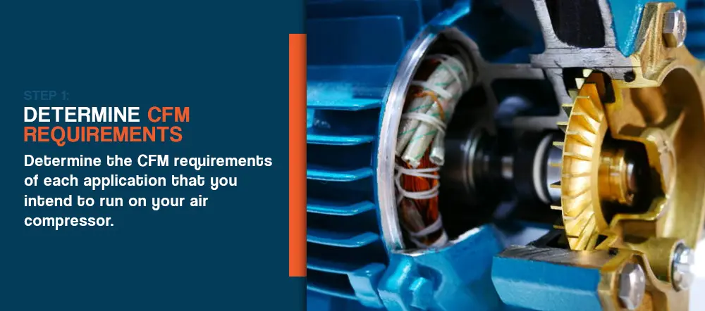 Going by the figure in step 2, the calculation for how much CFM you need in an air compressor would work as follows: 77 x 0.7 = 53.9 CFM. Thankfully, most rotary screw air compressors can offer well more than 53.9 CFM per duty cycle.