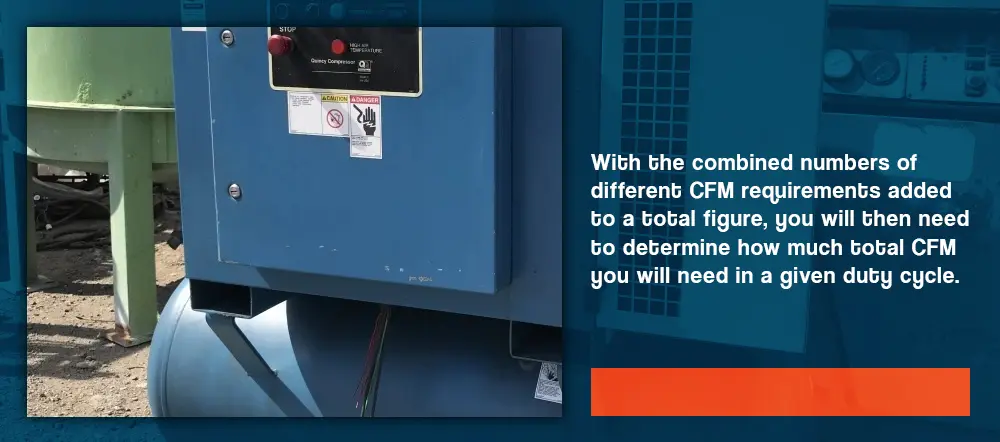 With the combined numbers of different CFM requirements added to a total figure, you will then need to determine how much total CFM you will need in a given duty cycle. For example, if you expect the tools to be active for 70% of each duty cycle, you would need to multiply your total combined air requirements by 0.7.