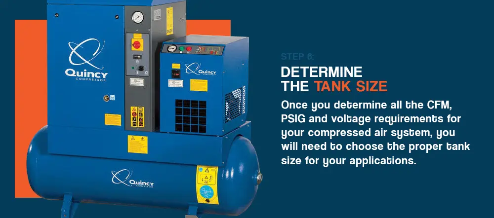 Once you determine all the CFM, PSIG and voltage requirements for your compressed air system, you will need to choose the proper tank size for your applications. Depending on whether you plan to operate at a small, medium or large scale, you will need to consider an air compressor size guide. The most common tank sizes in air compressors are 80 gallons, 120 gallons and 240 gallons.