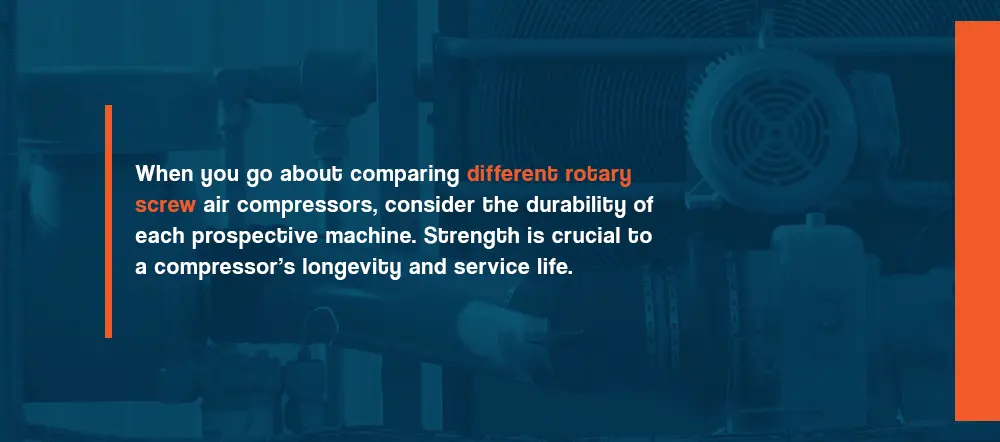 When you go about comparing different rotary screw air compressors, consider the durability of each prospective machine. Strength is crucial to a compressor’s longevity and service life. The investment you make upfront for a more robust machine can save you money in the long run because you will be less likely to encounter performance defects that could lead to costly maintenance bills. The features of an air compressor to check in this regard include the following.