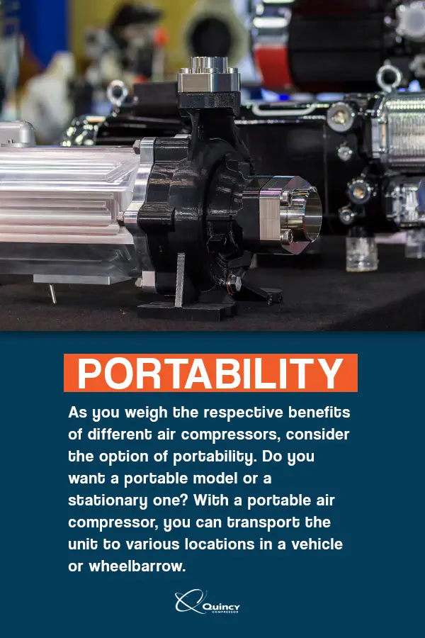 As you weigh the respective benefits of different air compressors, consider the option of portability. Do you want a portable model or a stationary one? With a portable air compressor, you can transport the unit to various locations in a vehicle or wheelbarrow. If you drive a truck, you can mount the compressor in back and power it up whenever the need arises. If you have a flat tire, you would be able to rectify the situation immediately.