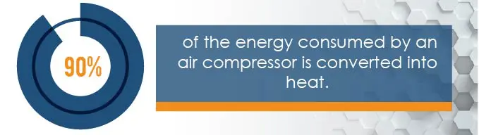 Recycling the heat generated by your air compressor is an ideal way to have a high-efficiency system. By installing an air compressor heat recovery unit, you can reduce your energy costs and consumption. It’s estimated that about 90% of the energy consumed by an air compressor is converted into heat, and a heat recovery system can capture anywhere from 50-90% of this heat to be used for ambient indoor heating.
