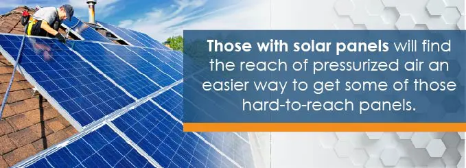 Using your air compressor to remove snow at home is also a possibility. Smaller home compressors won’t have the power to move much more than a light dusting, but those with solar panels will find the reach of pressurized air an easier way to get some of those hard-to-reach panels. A small tank you can carry will have enough compressed air for a small array, but if you’ve got a stationary unit with a long air line, you can blow off a good amount of snow from a larger solar panel array. And while you’ve got that air power out, you can also blow away the snow on your car, driveway, walkways and anywhere else you can travel with your compressor and air line.