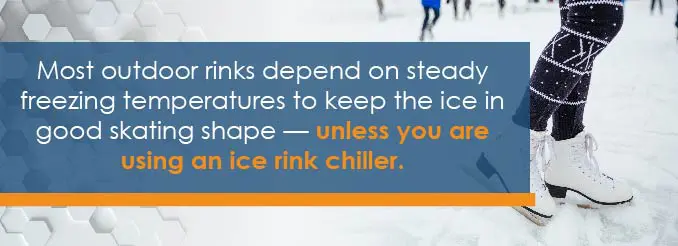 Unfortunately, most outdoor rinks depend on steady freezing temperatures to keep the ice in good skating shape — unless you are using an ice rink chiller. They are much like large flat refrigerators and are the reason some outdoor rinks can still be used well into the warmer days of spring. Ice rink chilling works much like your refrigerator does.