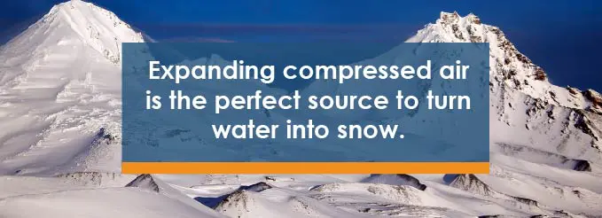 When air is compressed, it increases in temperature. Naturally, when it is expanded again, it decreases in temperature. This is why an air compressor is so great for making snow. With the right combination of air and water in your snowmaker, the water can immediately freeze into ice crystals that result in snow falling out of the mist.