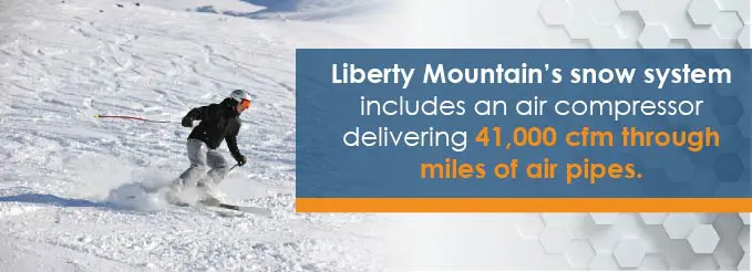 Snow-making in your backyard can be achieved with an air compressor that delivers at least 60 psi and 5 cfm. Snow-making at ski resorts requires a slightly bigger system. Liberty Mountain Resort describes their snow-making system, which includes an air compressor delivering 41,000 cfm through miles of air pipes along with water pipes that pump an average of 4,700 gpm of water. They estimate they can make about 1,300 tons of snow in an hour with their system.