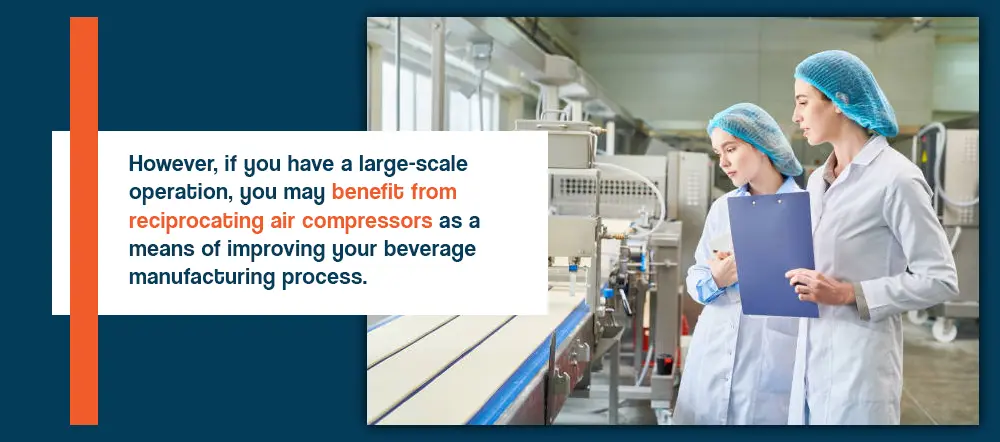 However, if you have a large-scale operation, you may benefit from reciprocating air compressors as a means of improving your beverage manufacturing process. These larger compressors work best for continuous use and heavy-duty operation.