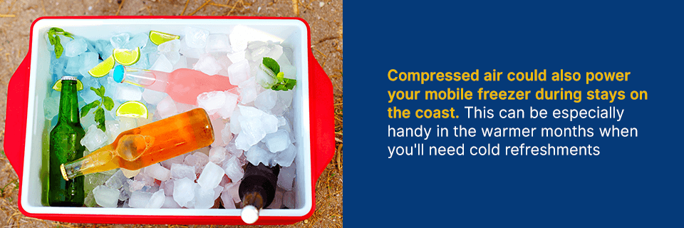 Un compresor de aire podría usarse para alimentar una unidad móvil de refrigeración durante tus viajes a la playa. Si acampas en la costa durante varias noches y días con tienda y sacos de dormir, podrías conectar ese compresor a un generador de energía y luego usar el aire comprimido para refrigerar tus alimentos y bebidas perecederas.