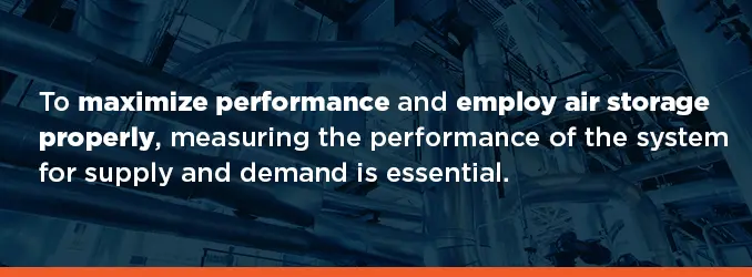 Para el almacenamiento, los receptores de aire suelen instalarse en un sistema de aire comprimido, pero para maximizar el rendimiento y emplear adecuadamente el almacenamiento de aire, es esencial medir tanto el rendimiento del sistema en cuanto a oferta como en demanda.