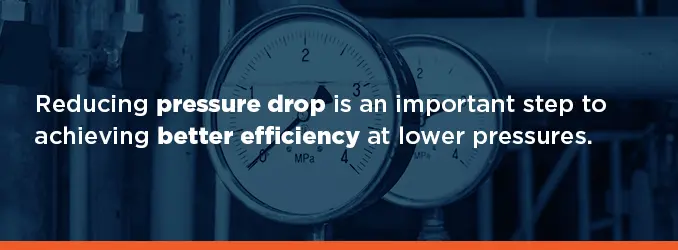 Reducir la caída de presión es un paso importante para lograr una mejor eficiencia a presiones más bajas. Reducir los niveles de presión al operar maquinaria que utiliza grandes cantidades de aire comprimido puede reducir drásticamente los gastos y suponer un ahorro energético anual significativo para tu planta. Puede que necesites cilindros de aire más grandes para mantener el funcionamiento adecuado de las máquinas que funcionan a niveles de presión más bajos. Sin embargo, el coste de ampliar el tamaño del almacenamiento será una inversión mayor para ahorrar en gastos energéticos.