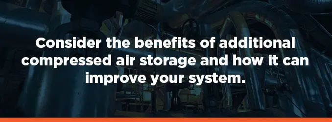 Al diferenciar entre los requisitos de almacenamiento de los sistemas de aire comprimido y los controles, se necesita menos almacenamiento que otros dependiendo de la necesidad. Los niveles de carga más altos y bajos se benefician de forma diferente respecto a los controles y el almacenamiento. Algunos profesionales han dicho que ciertos compresores no necesitan almacenamiento de aire, pero el sistema en general se beneficiará de volúmenes de almacenamiento de aire comprimido que pueden reducir la demanda para ciertas aplicaciones.