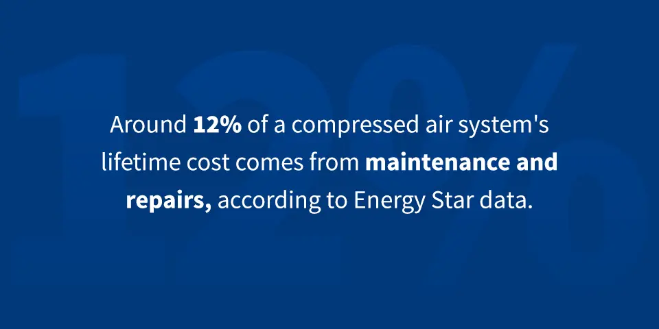 Alrededor del 12% del coste de vida útil de un sistema de aire comprimido proviene del mantenimiento y las reparaciones, según los datos de Energy Star. Estos gastos incluyen mano de obra y materiales de reemplazo. También puede que tengas costes por retrasos en el proyecto si se necesitan reparaciones en un momento crítico.