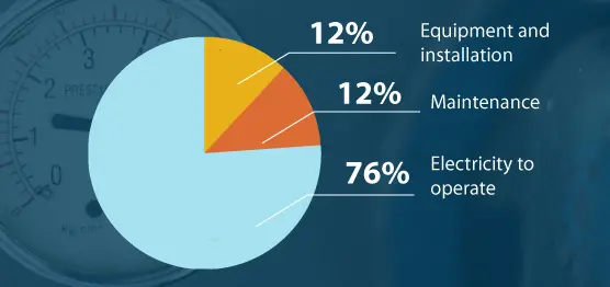Aunque mucha gente asume que la compra inicial de un sistema de aire comprimido es la mayor parte del coste, en realidad es la electricidad necesaria para hacer funcionar la máquina y el equipo lo que resulta ser más caro. De hecho, el propio sistema solo cuesta alrededor del 10% del coste total de producción de aire comprimido.