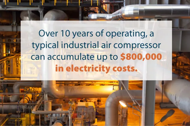 Aunque parezca mentira, operar un compresor suele ser más caro que comprarlo. Energy Star afirma que, de media, el 76 por ciento del coste de vida útil de un compresor de aire es electricidad. En muchas empresas, el aire comprimido es una de las instalaciones más caras. En más de 10 años de funcionamiento, un compresor de aire industrial típico puede acumular hasta 800.000 dólares en costes eléctricos.