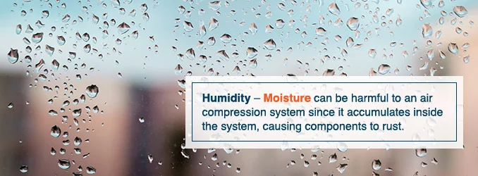 - Humedad: La humedad puede ser perjudicial para un sistema de compresión de aire cuando se acumula en su interior, causando que los componentes se oxiden. Esto puede provocar desgaste, fugas y una reducción de la capacidad de almacenamiento. El aire seco es menos probable que dañe tu sistema de compresión de aire y las herramientas que realizan el trabajo en el punto de uso. Para reducir la humedad, utiliza tu sistema de aire comprimido solo en ambientes secos.
