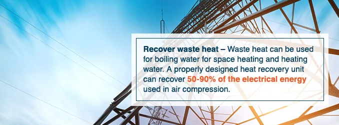 - Recuperar el calor residual: El calor residual puede usarse para hervir agua para calefacción y para calentar agua. Una unidad de recuperación de calor bien diseñada puede recuperar entre el 50 y el 90% de la energía eléctrica utilizada en la compresión del aire.