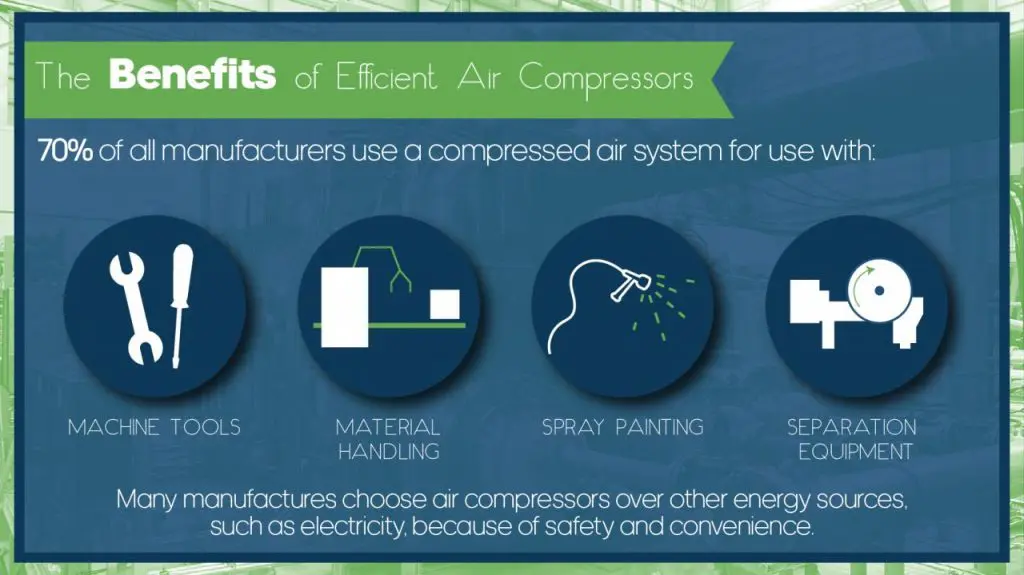 Existen muchos usos del aire comprimido. De hecho, el 70 por ciento de todos los fabricantes utiliza un sistema de aire comprimido, para usarse con máquinas-herramienta, manipulación de materiales, así como para pintura en spray y equipos de separación. Una de las razones de esa popularidad es la seguridad y comodidad de utilizar el aire como recurso, en contraposición a otras fuentes de energía como la electricidad.