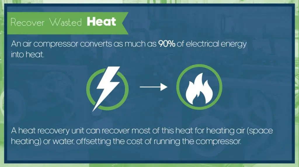 Un compresor de aire convierte hasta el 90 por ciento de la energía eléctrica en calor. Sin embargo, una unidad de recuperación de calor puede recuperar la mayor parte de este calor para calentar aire (calefacción de ambiente) o agua, compensando así el coste de mantener el compresor en funcionamiento.