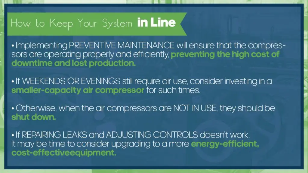 Implementar un mantenimiento preventivo garantizará que los compresores funcionen correctamente y de forma eficiente, evitando el alto coste de la inactividad y la pérdida de producción. Cuando no se usan, deben apagarse. Si los fines de semana o las noches aún necesitan aire, considera invertir en un compresor de menor capacidad para esos momentos.