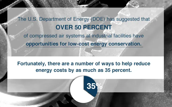 El Departamento de Energía de EE. UU. (DOE) ha sugerido que más del 50 por ciento de los sistemas de aire comprimido en instalaciones industriales tienen oportunidades para la conservación de energía a bajo coste.