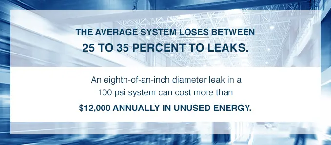 El sistema medio pierde entre un 25 y un 35 por ciento debido a fugas, por lo que los controles de costes requieren monitorización y reparaciones rutinarias. Las fugas de aire pueden ser el mayor desperdicio de energía de aire comprimido en una planta de fabricación. Por ejemplo, una fuga de un octavo de pulgada de diámetro en un sistema de 100 psi puede costar más de 12.000 dólares anuales en energía no utilizada.