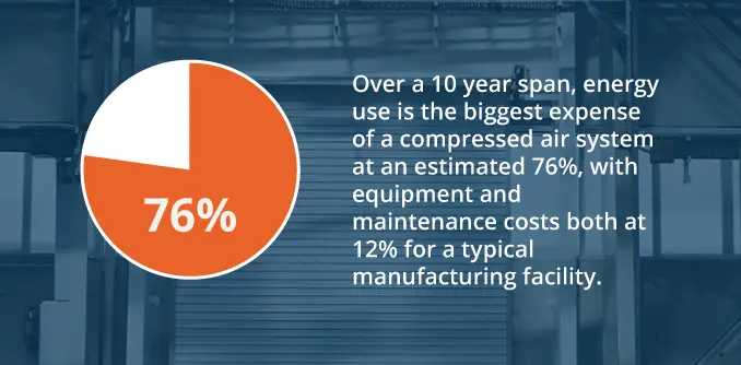 En un periodo de 10 años, el consumo energético es el mayor gasto de un sistema de aire comprimido , con un estimado del 76%, con costes de equipos y mantenimiento que alcanzan ambos el 12% para una planta de fabricación típica.