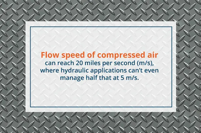 Los sistemas de compresores de aire también permiten una mayor conversión de energía en trabajo en comparación con las operaciones hidráulicas. La velocidad de flujo del aire comprimido puede alcanzar las 20 millas por segundo (m/s), mientras que las aplicaciones hidráulicas ni siquiera logran la mitad a 5 m/s. Este beneficio no será relevante para todos los usos de las herramientas eléctricas, pero para aquellas aplicaciones donde la producción de calidad puede realizarse a velocidades más altas, las herramientas neumáticas son una solución bienvenida con beneficios económicos que afectan a fabricantes y consumidores.