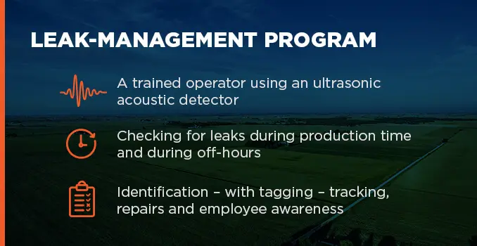 Las fugas no planificadas en tu sistema de aire comprimido podrían estar desperdiciando una cantidad significativa de aire. Hasta el 30 por ciento del aire producido se ha atribuido a sistemas con fugas en instalaciones industriales que no realizan revisiones regulares de detección y reparación de fugas. En una fábrica de muebles, se detectaron 55 fugas, de las cuales entre el 90 y el 95 por ciento ocurrían en los circuitos neumáticos, no en las líneas.