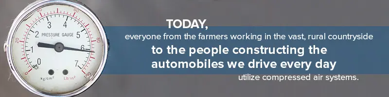 Desde entonces, los sistemas de aire comprimido se han vuelto más complejos. Ahora son componentes esenciales en el mundo industrial moderno. Hoy en día, desde los agricultores que trabajan en el vasto campo rural hasta las personas que construyen los automóviles que conducimos cada día, utilizan sistemas de aire comprimido. Las industrias de equipos médicos y farmacéuticos, la industria energética y las instalaciones de fabricación utilizan aire comprimido en sus operaciones diarias para producir los muchos bienes y servicios a los que nos hemos acostumbrado.