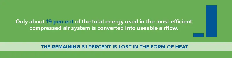 El aire comprimido es importante por su limpieza y facilidad de uso. Desafortunadamente, también es una utilidad cara. Solo alrededor del 19 por ciento de la energía total utilizada en el sistema de aire comprimido más eficiente se convierte en flujo de aire utilizable. El 81 por ciento restante se pierde en forma de calor, por eso es tan importante mantener y seleccionar el mejor sistema para tu negocio. No reparar fugas de aire, o usar aire comprimido cuando existen alternativas más baratas, puede costarte dinero a largo plazo y puede reducir recursos que podrían emplearse mejor en otras necesidades empresariales.