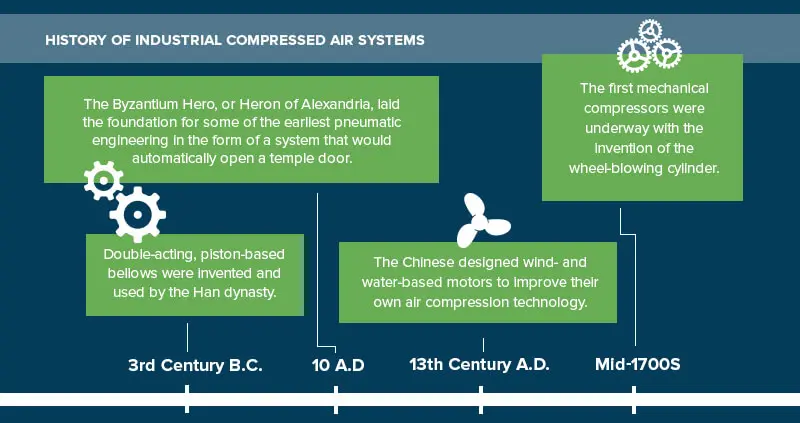 Los primeros compresores de aire industriales eran sistemas de baja presión. Estos sistemas mejoraron a lo largo de los siglos. En la antigua China, alrededor del siglo III a.C., los fuelles de doble acción con pistones fueron inventados y utilizados por la dinastía Han. En el año 10 d.C., el Héroe Bizancio, o Garza de Alejandría, sentó las bases de algunas de las primeras técnicas neumáticas en forma de un sistema que abría automáticamente la puerta de un templo. En todo el mundo, los desarrollos continuaron, aunque muchos de los pueblos del mundo estaban separados por océanos y grandes distancias. Para el siglo XIII d.C., los chinos diseñaron motores basados en viento y agua para mejorar su propia tecnología de compresión de aire.