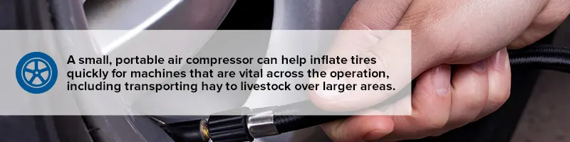 Muchas de las herramientas que utilizan los agricultores dependen de sistemas de aire comprimido que exigen fiabilidad y longevidad para mantener una operación eficiente. Se pueden utilizar sistemas de compresores de aire más pequeños para el mantenimiento rutinario de la granja. Los tractores y otros vehículos como los quads pierden presión de neumáticos al trabajar o cuando están expuestos a los elementos. Un compresor de aire pequeño y portátil puede ayudar a inflar rápidamente los neumáticos para máquinas que son vitales en toda la operación, incluyendo el transporte de heno al ganado en áreas más grandes.