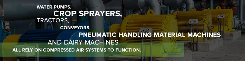 Las máquinas sofisticadas y las ciencias agrícolas avanzadas ayudaron a los agricultores a obtener mayores rendimientos, cosechar sus cosechas de forma más eficiente y reducir el número de horas trabajadas, proporcionando además mayores rendimientos para sus esfuerzos. Bombas de agua, pulverizadores de cultivos, tractores, cintas transportadoras, máquinas neumáticas de manipulación de materiales y máquinas lácteas dependen de sistemas de aire comprimido para funcionar.