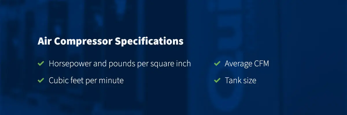 Each air compressor model has different specifications. Knowing these specifications is essential to ensure you choose the right fit for your needs. Some air compressor specs you should look for include: