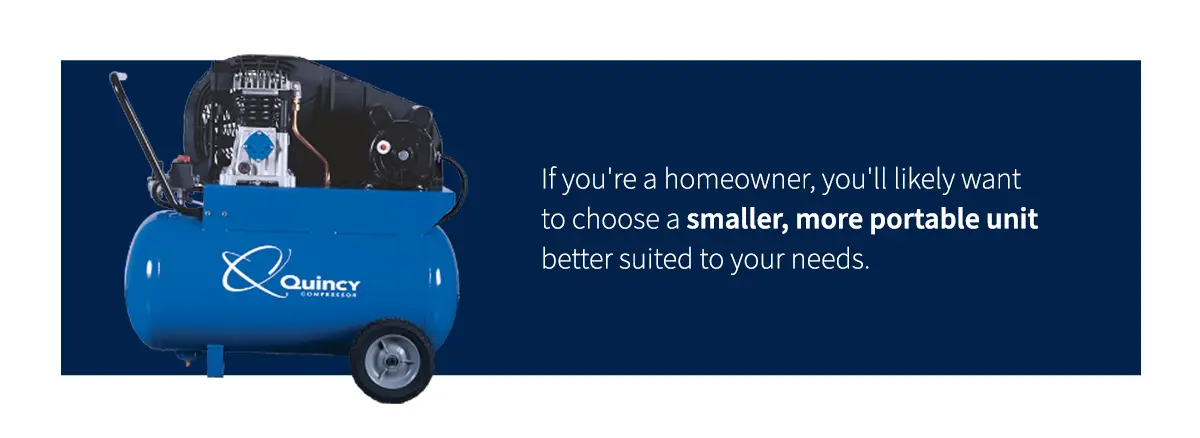Some types are more suited to different industries and uses than others. Rotary screw compressors are often used in industrial settings since they provide high-powered air with extreme precision. If you’re a homeowner, you’ll likely want to choose a smaller, more portable unit better suited to your needs, whether it’s inflating different items or pressure washing your home.