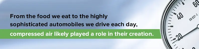 Many other industries, including energy exploration, food and beverage packaging and dry cleaning also depend on the advancements of today’s versatile compressed air systems. From the food we eat to the highly sophisticated automobiles we drive each day, compressed air likely played a role in their creation.