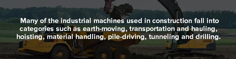 Construction equipment encompasses everything from hand tools and pneumatic air compressor systems to other pieces of industrial machinery like loaders and scrapers. Many of the industrial machines used in construction fall into these categories: earth-moving, transportation and hauling, hoisting, material handling, pile-driving, tunneling and drilling.