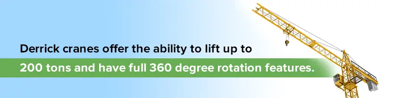 These cranes do offer the ability to lift up to 200 tons and have full 360-degree rotation features. They operate under diesel power and electric power. For longer-term projects, derrick cranes are more common than mobile cranes, which are employed on a short-term basis.