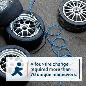 By this stage, pit crew operations reached a 33-second milestone. The introduction of choreography streamlined the over-the-wall routine and made four-tire changes possible — a task which requires more than 70 unique maneuvers. Drivers often insisted on two-tire changes, which could be carried out in under 20 seconds.