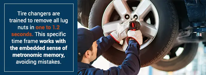 In fact, tire changers are trained to remove all five lug nuts from each wheel in one to 1.2 seconds and not a millisecond faster. At speeds of nine tenths of a second for example, the embedded sense of metronomic memory that is developed is interrupted and this can cause the crewman to make more mistakes.
