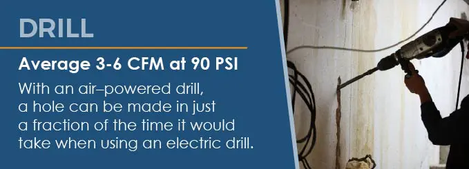 Drills require air pressures of an average of 3 to 6 CFM at 90 PSI.