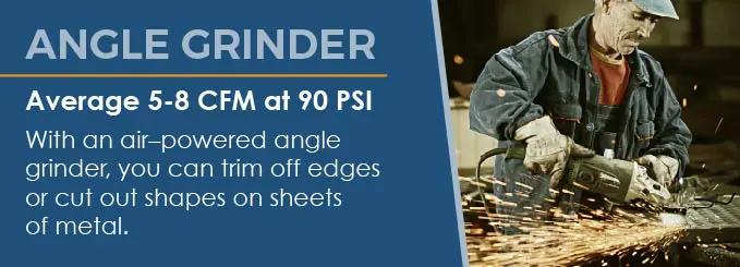 Angle grinders require air pressures of an average of 5 to 8 CFM at 90 PSI.